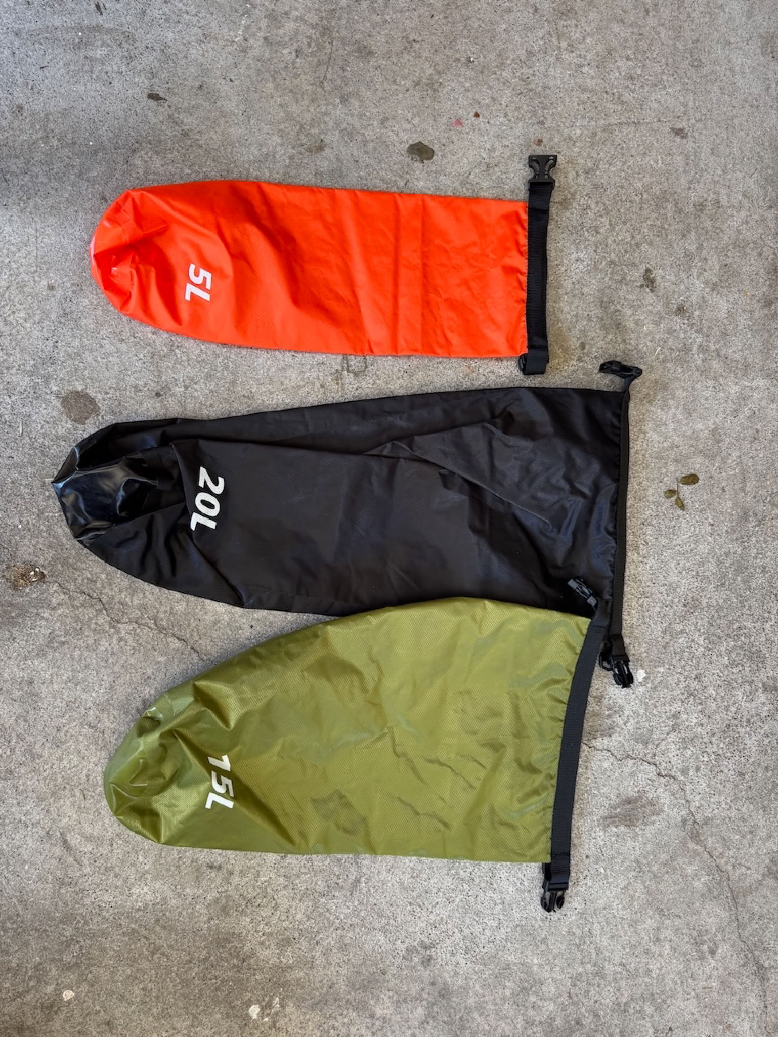 Max 5$ each! Good enough for watertight internal packing – eg pack into other bags.20L may be big enough for sleeping bags; 5L fits well in front hatches of Quest foredeck. Holds flares and lunch.